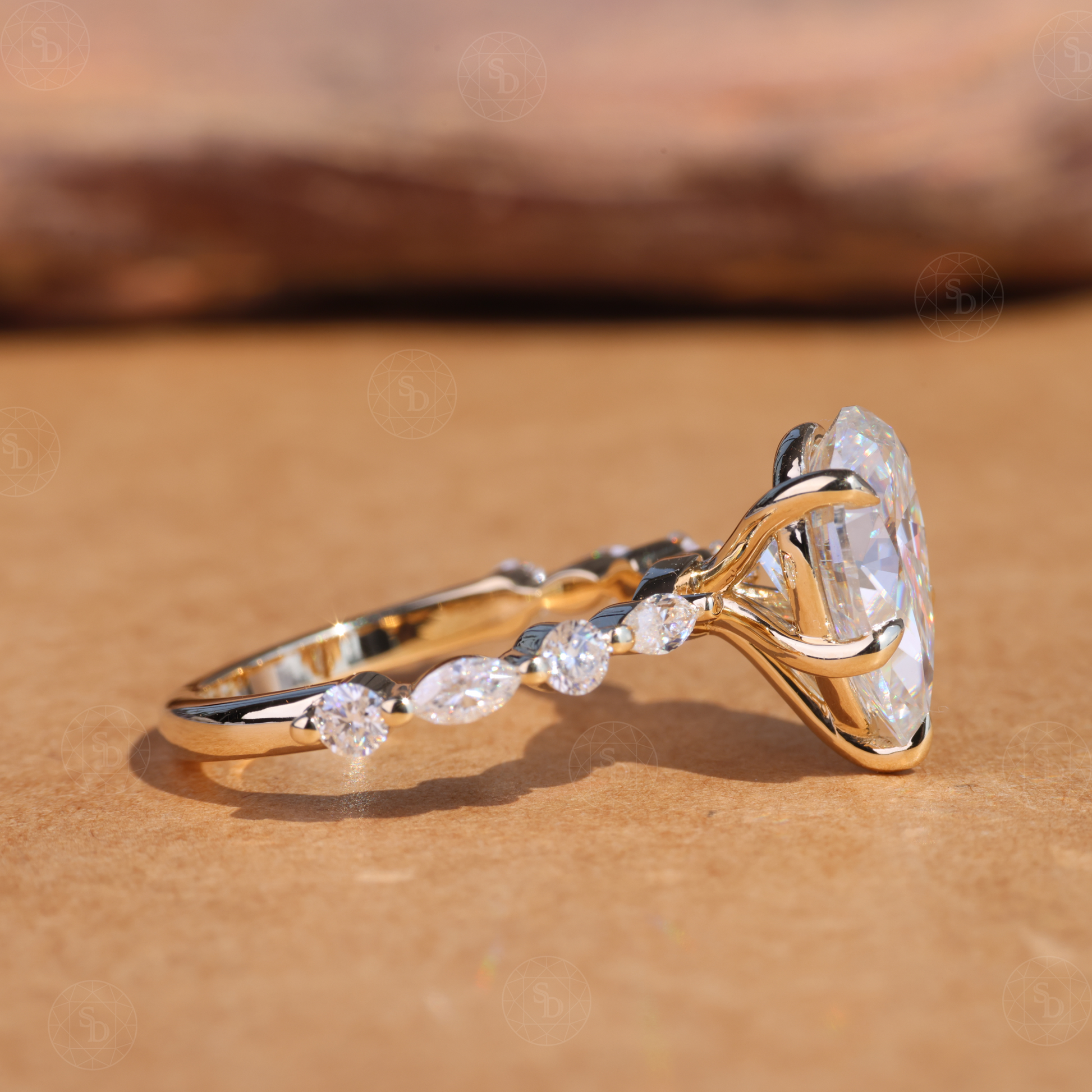 Elevate your love story with our exquisite Pear Cut Lab Grown Diamond Ring, featuring a stunning 2 CTW pear-shaped center, perfectly complemented by alternating marquise and round diamonds. This unique engagement ring not only symbolizes your commitment but also sets you apart with its brilliant design and ethical craftsmanship.