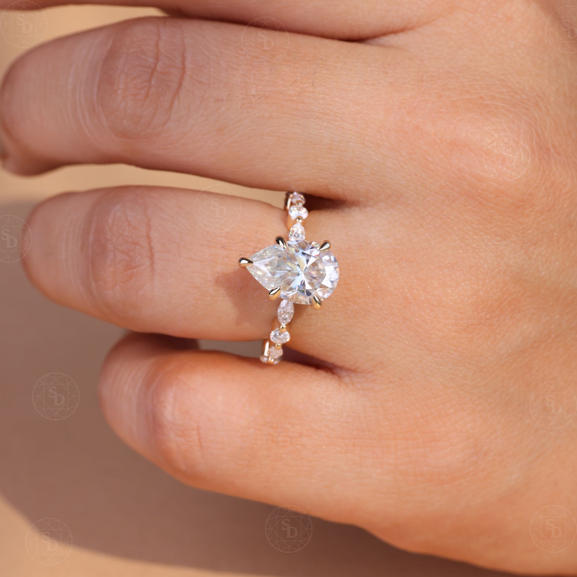 Crafted with a dazzling 2 carats of high-quality lab-grown diamonds and ethically sourced materials, this ring ensures a captivating sparkle without compromising values. The pear cut lends an elegant touch, while the alternate diamond shapes create visual interest, making it a standout piece for any occasion.